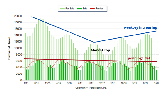 The average Days on Market (DOM) shows how many days the average property is on the market before it sells. An upward trend in DOM tends to indicate a move towards a Buyer’s market while a downward trend indicates a move towards a Seller’s market. The DOM for January 2020 was 83, up 5.1% from 79 days in January of last year.