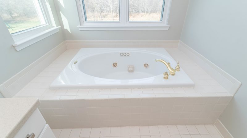 - private bath with a double sink vanity, a walk-in shower, and a spa tub